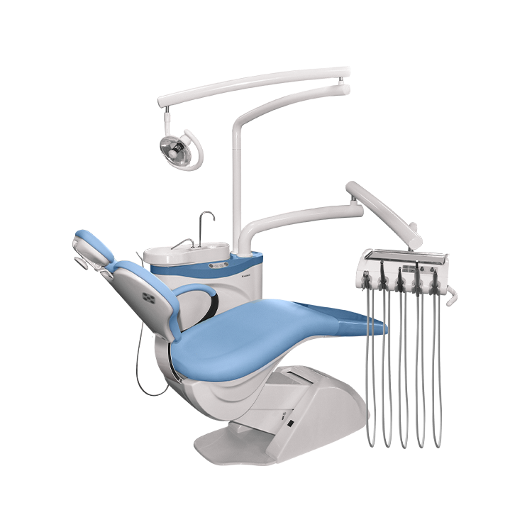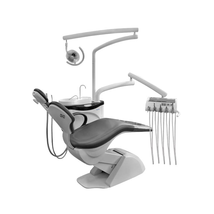 Basic model of a dental unit with upper or lower guide of hoses. The set can be fitted with up to five instruments and enables full treatment of the patient. The chair is equipped with a zero position.